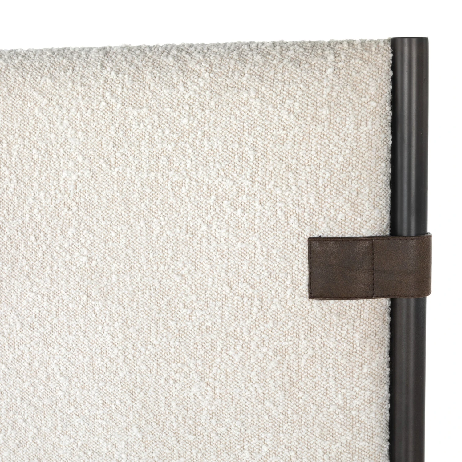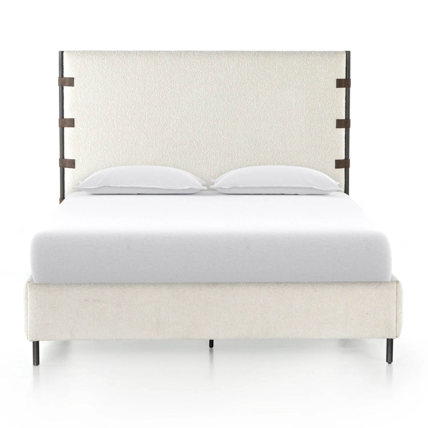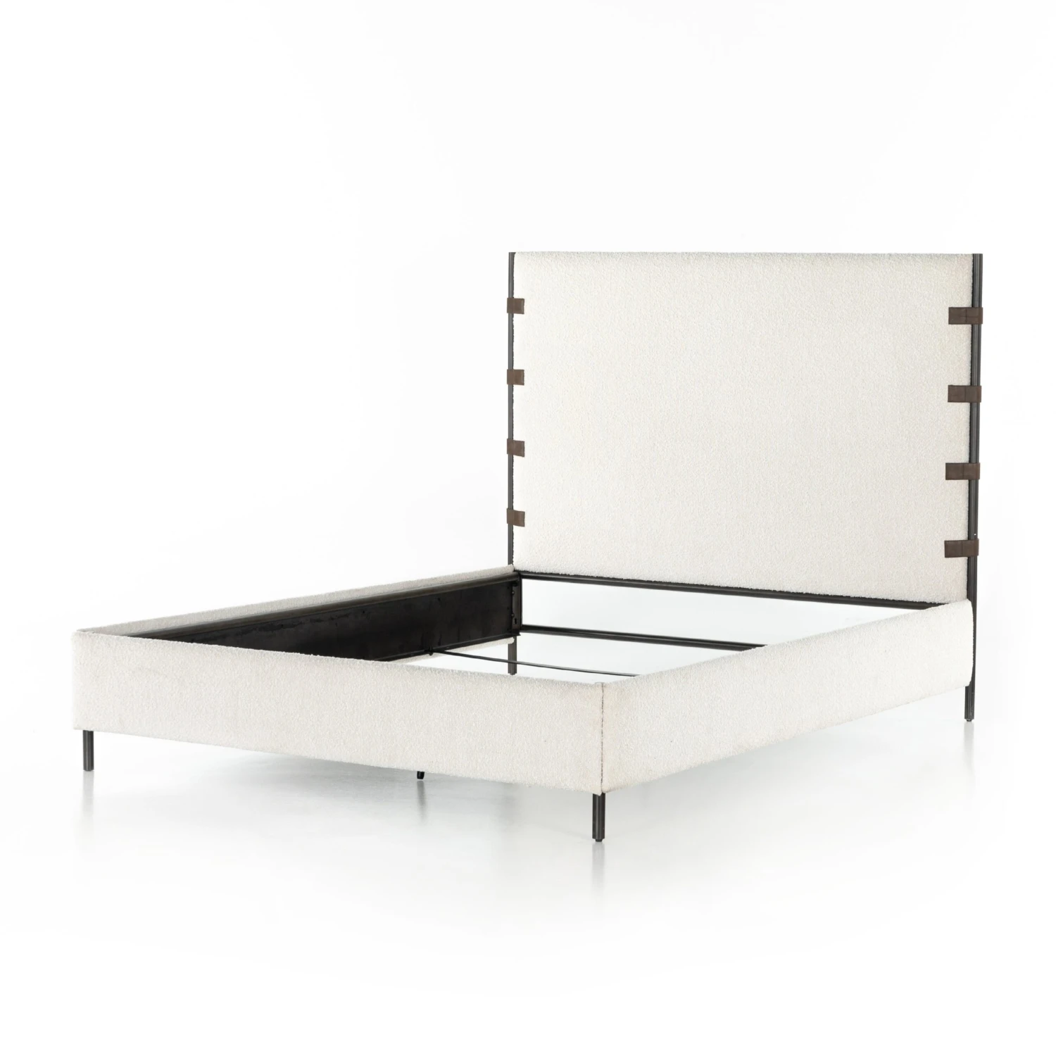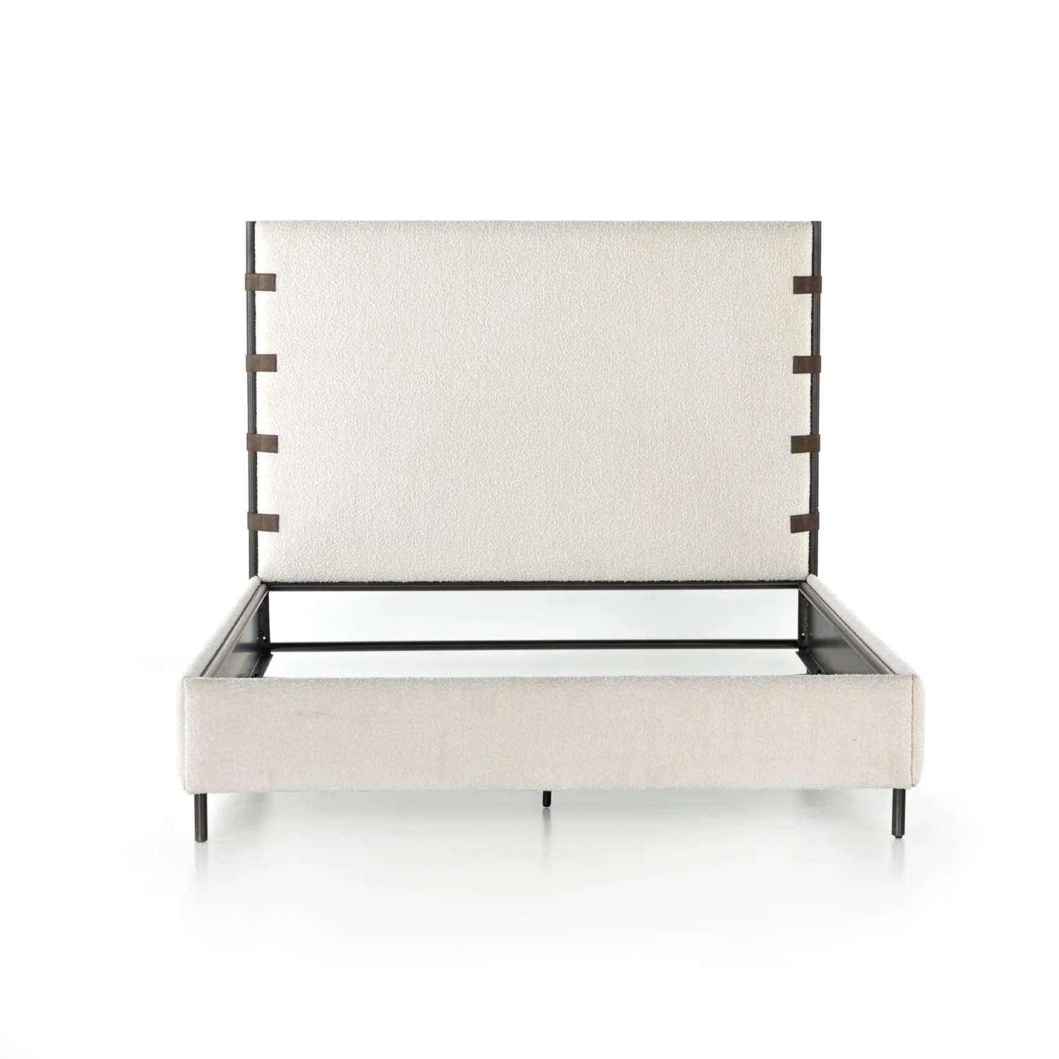Bring texture into play. Upholstered in a classic cream-colored boucle, with decorative leather sling straps adding a material-driven touch with contrast. Standard box spring required. This bed is not compatible with an adjustable mattress.