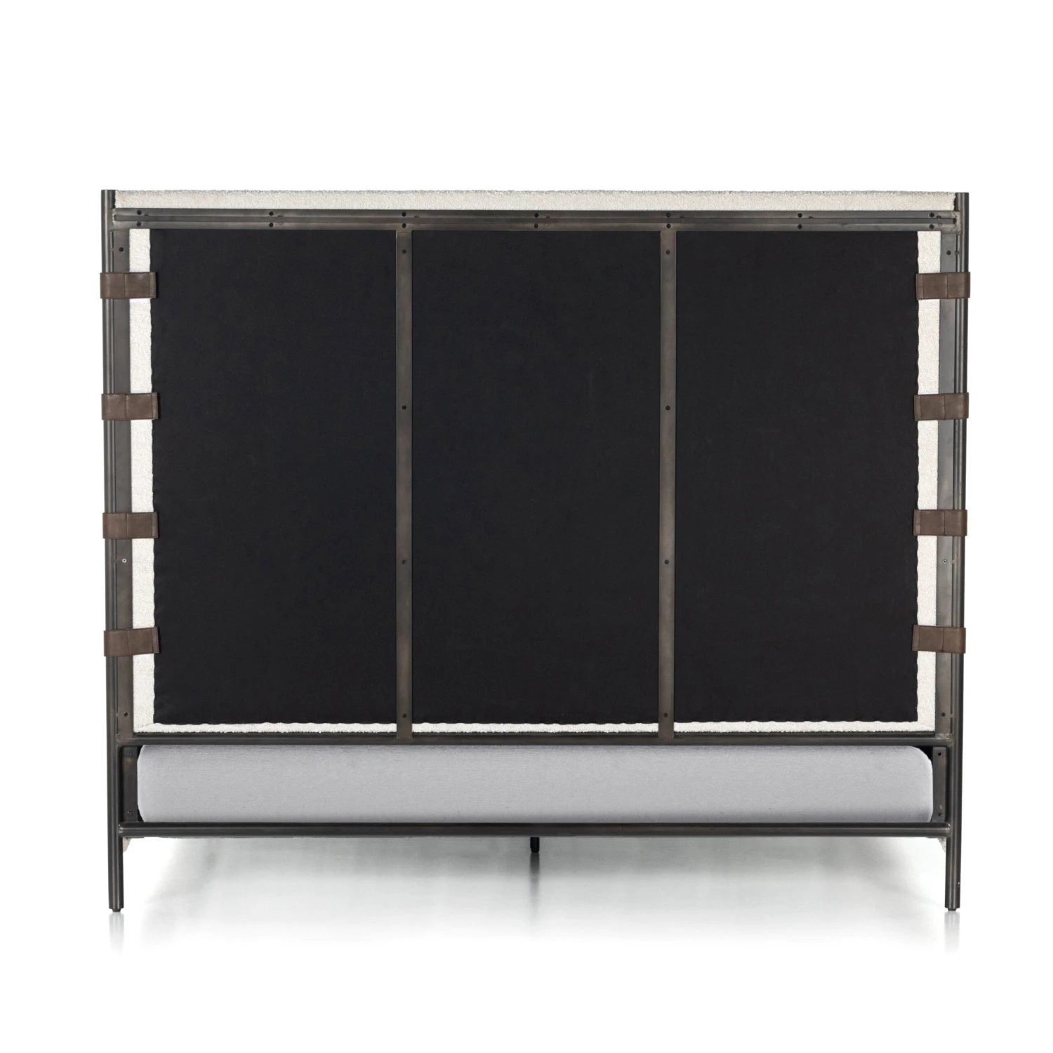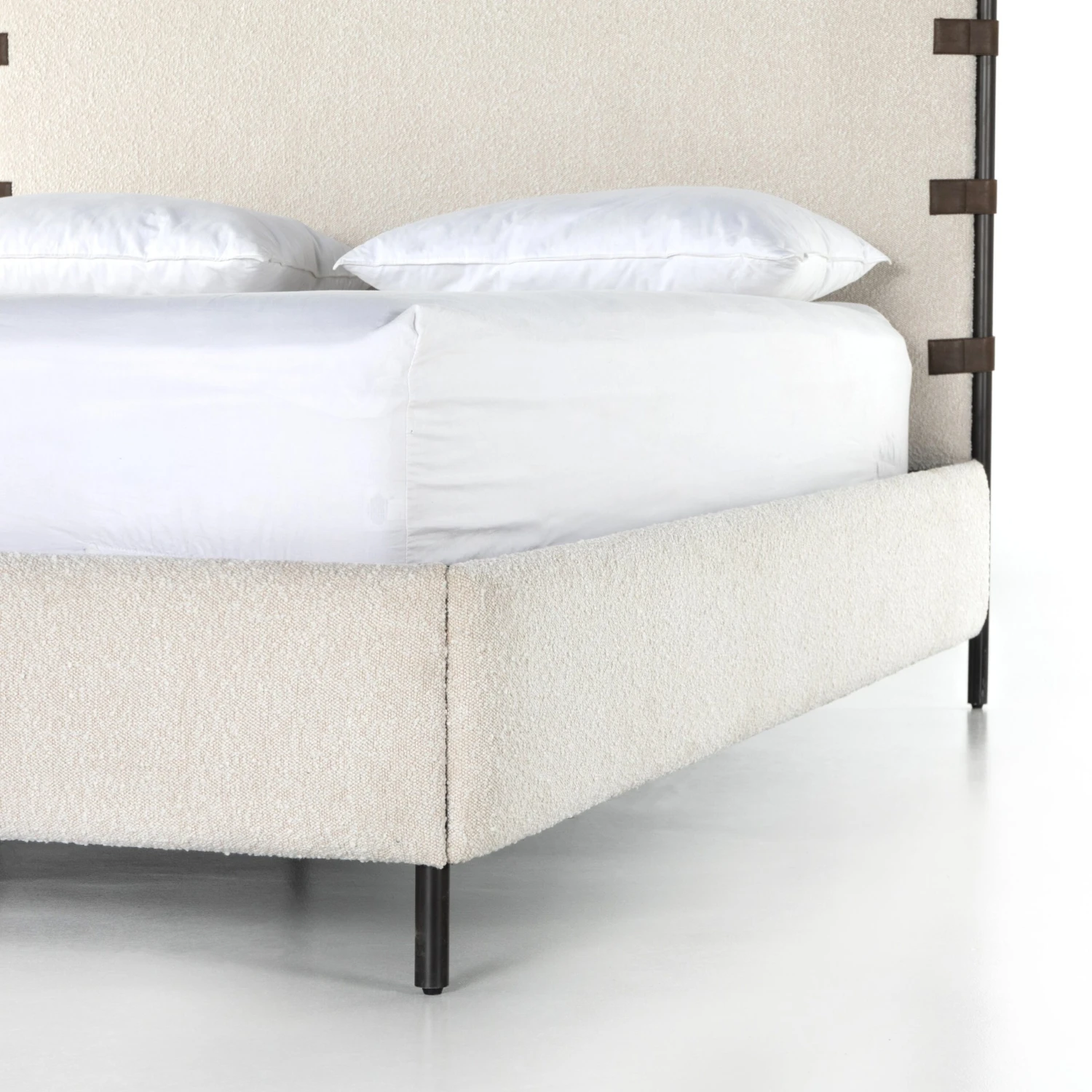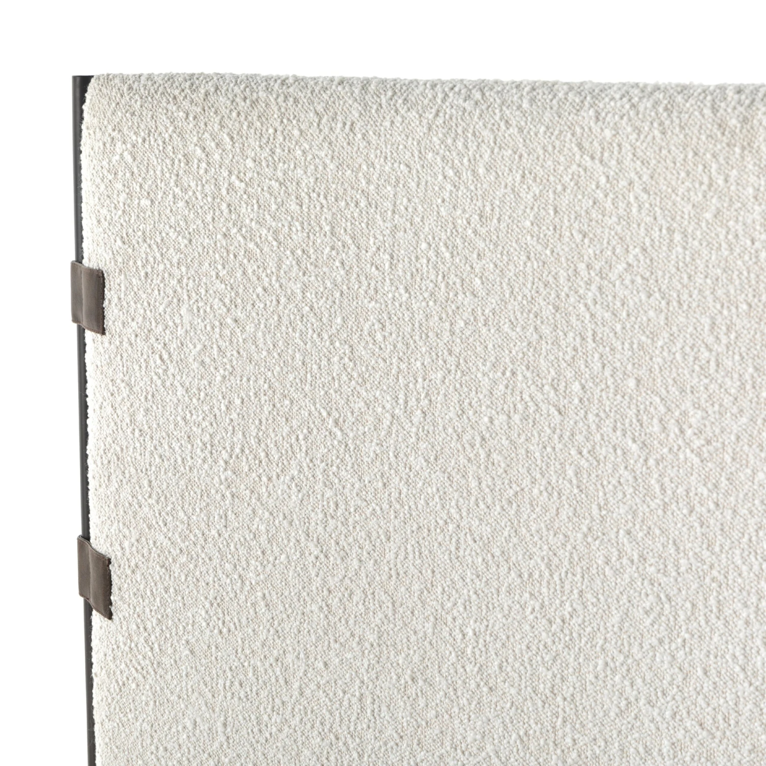 Bring texture into play. Upholstered in a classic cream-colored boucle, with decorative leather sling straps adding a material-driven touch with contrast. Standard box spring required. This bed is not compatible with an adjustable mattress.