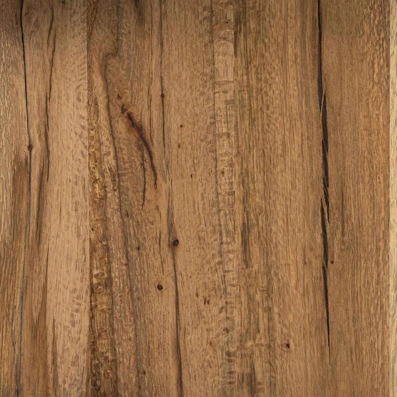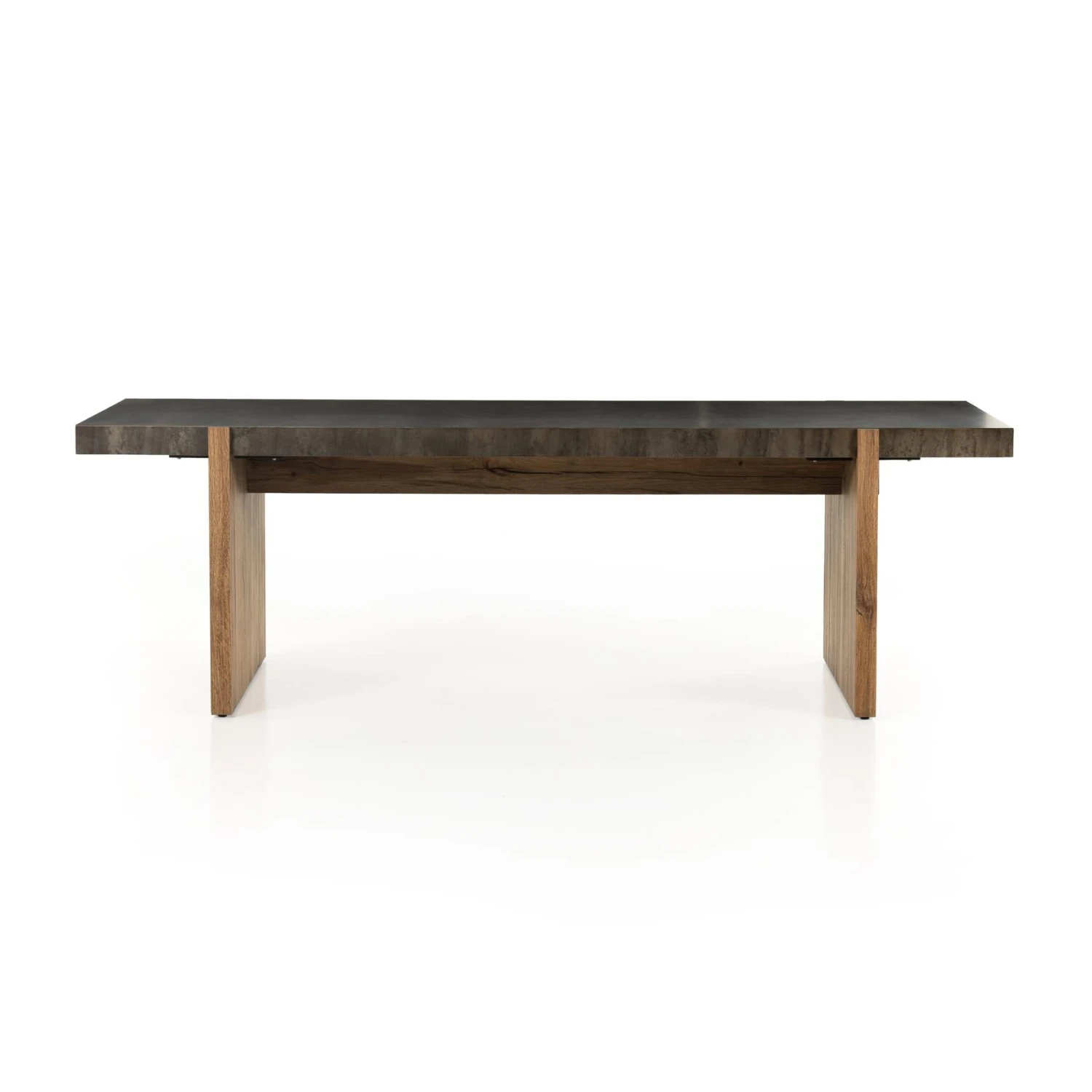An organic-spirited statement piece. With thick, wide proportions, a dining table of distressed iron tops an intersecting cradle-like base of rustic, character-rich oak with beautiful highs and lows. Seats eight comfortably.
