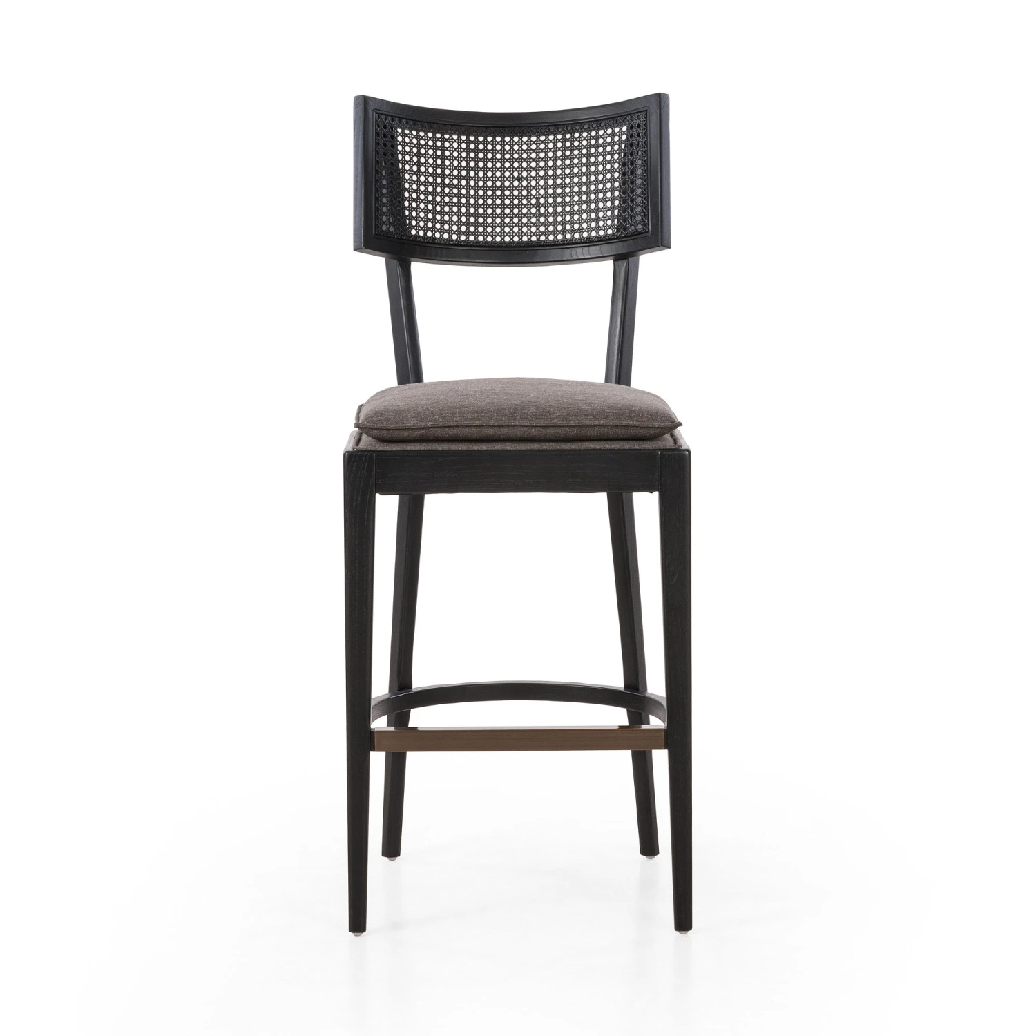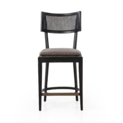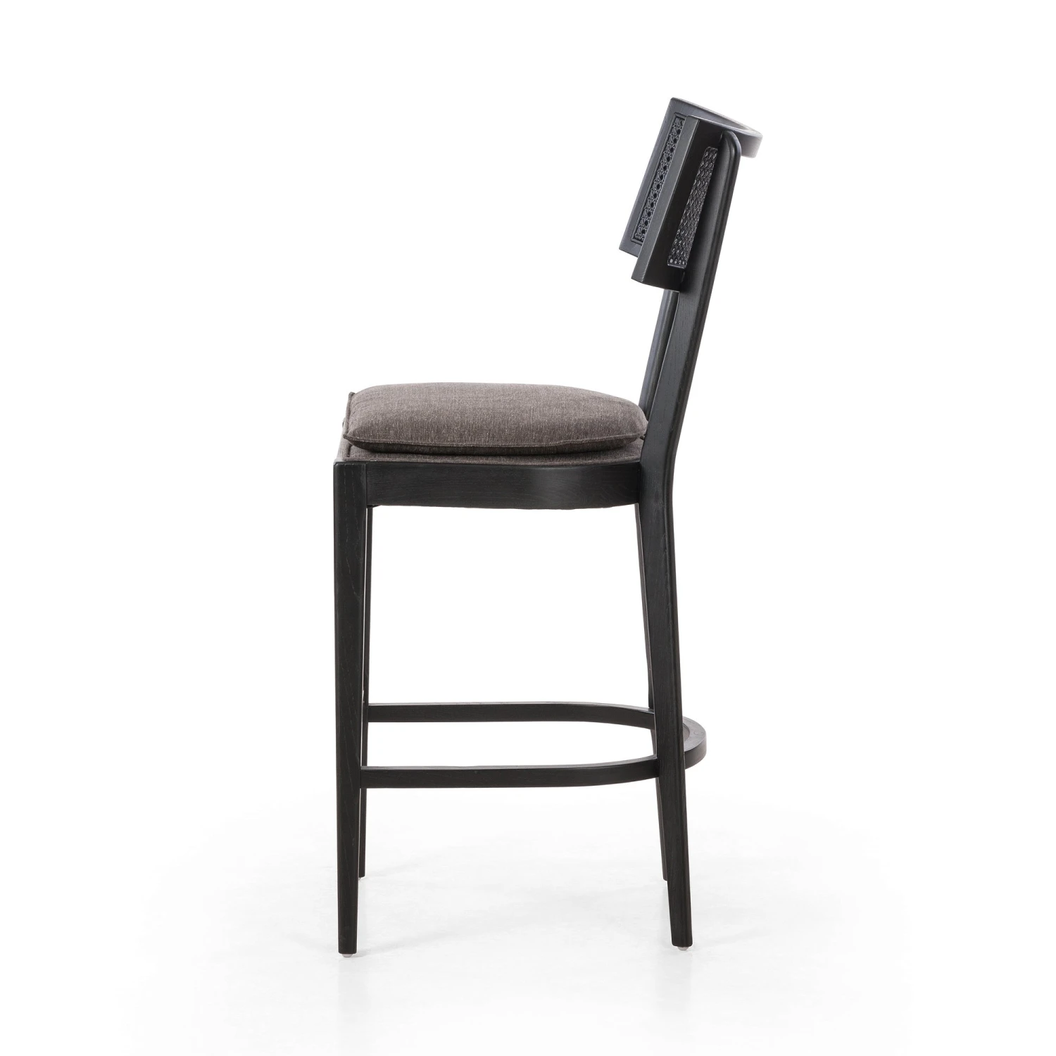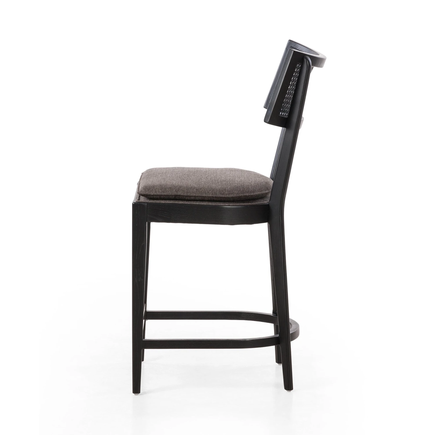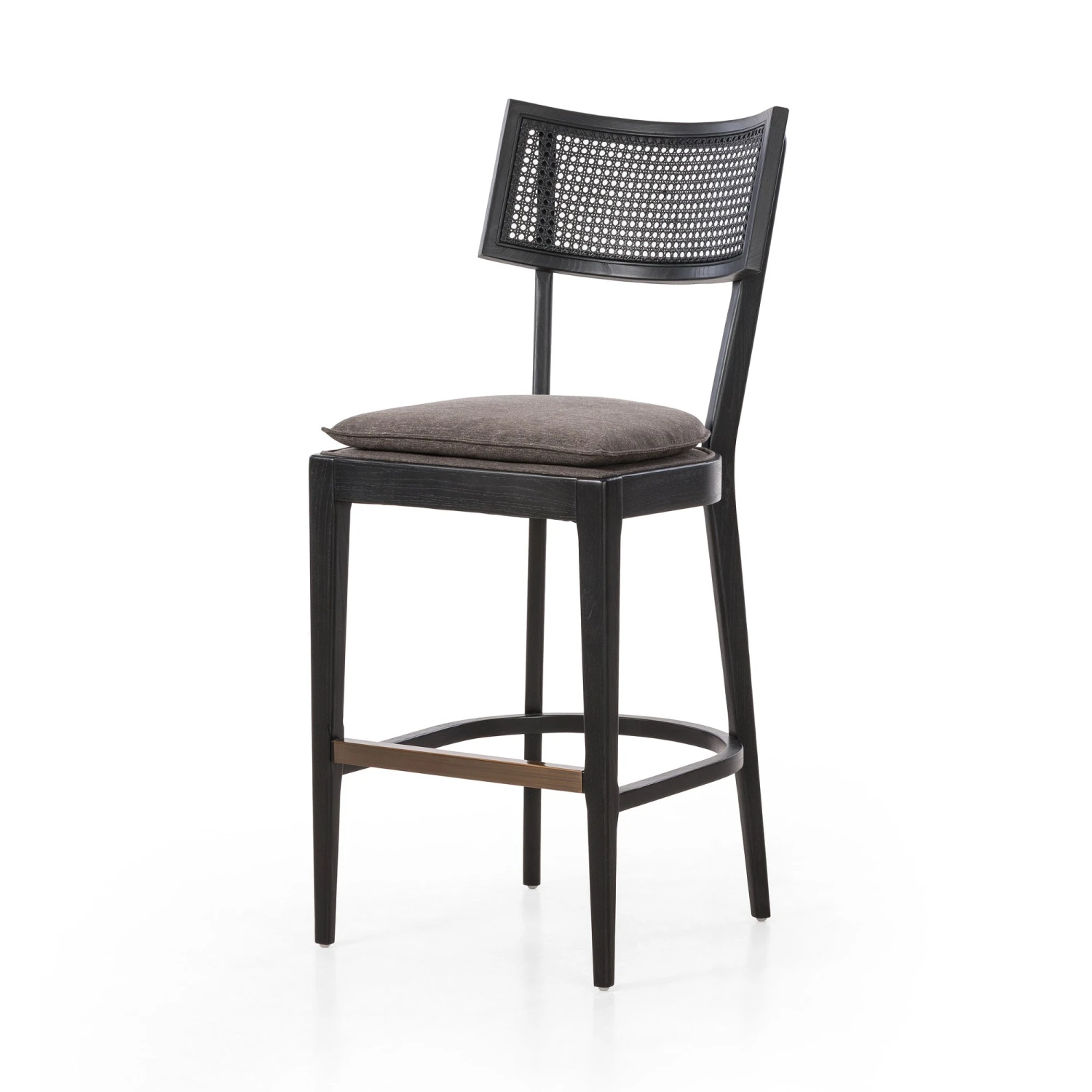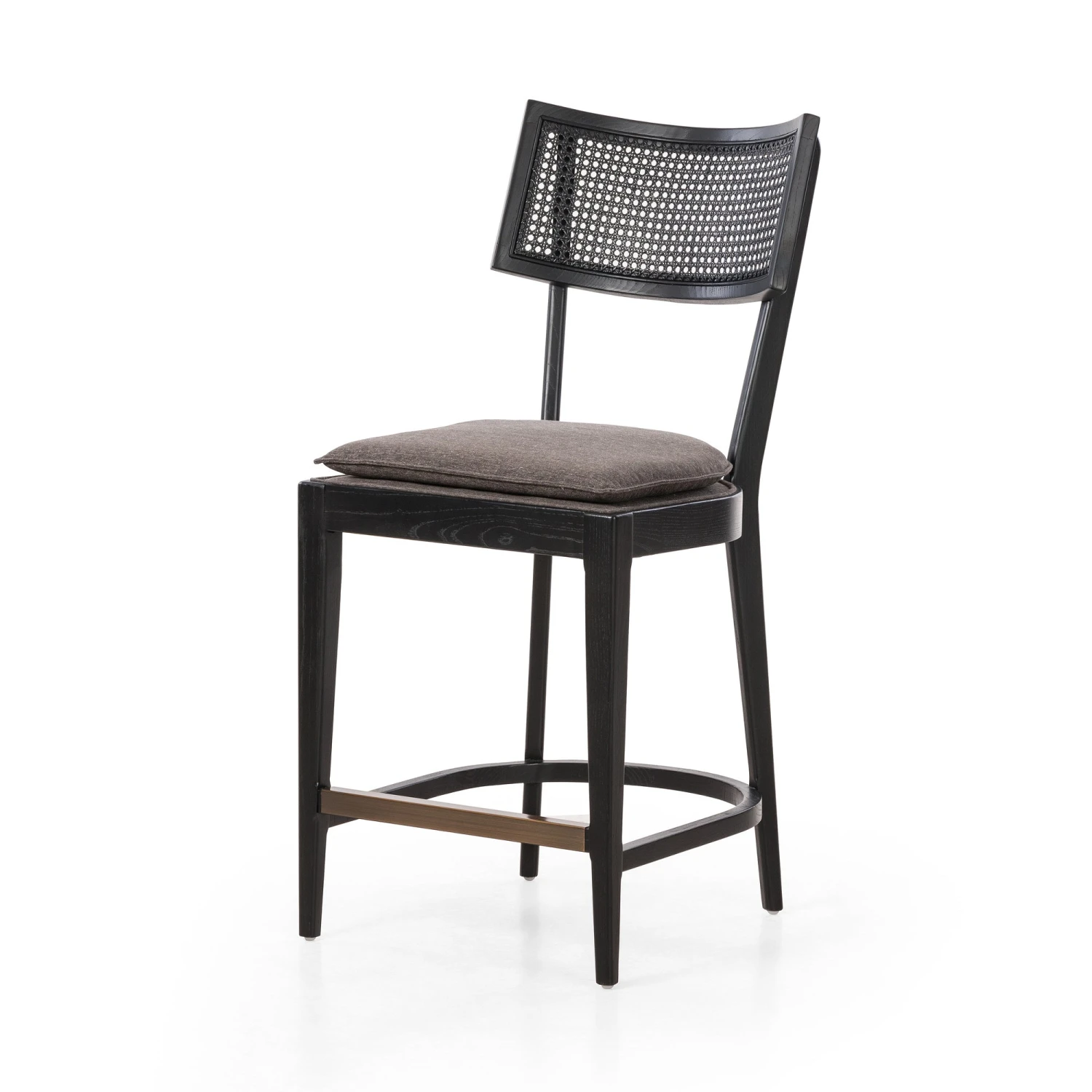 Mixed materials refresh retro styling. Ebony-brushed parawood frames a textural inlay of black cane for a moody, monochromatic look. Fastened by Velcro, a charcoal-colored cushion of high-performance fabric makes this counter stool great for entertaining or everyday use. Performance fabrics are specially created to withstand spills, stains, high traffic and wear, ensuring long-term comfort and unmatched durability.