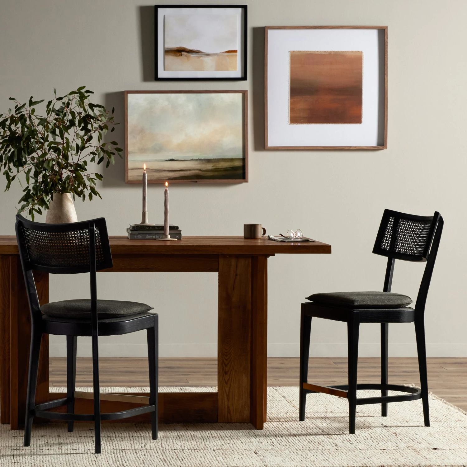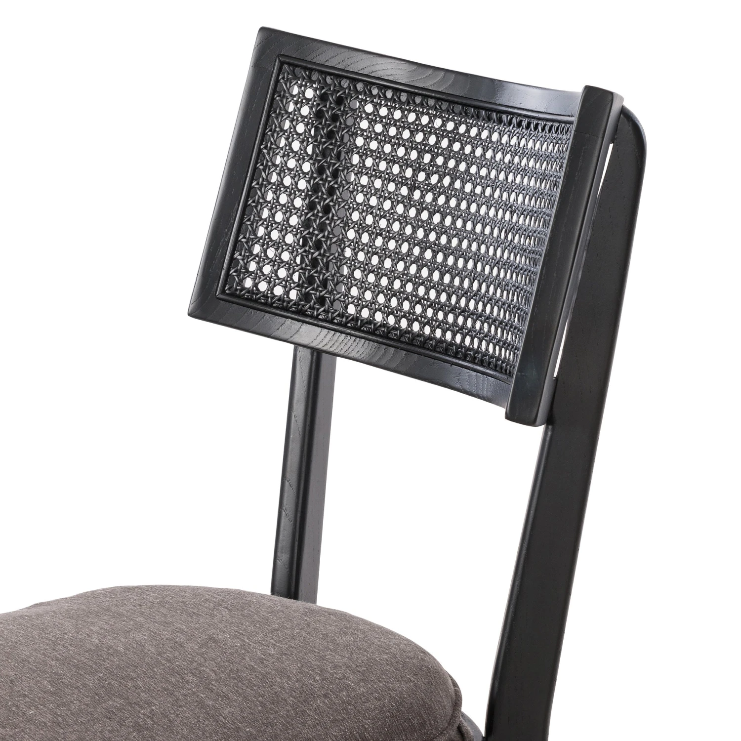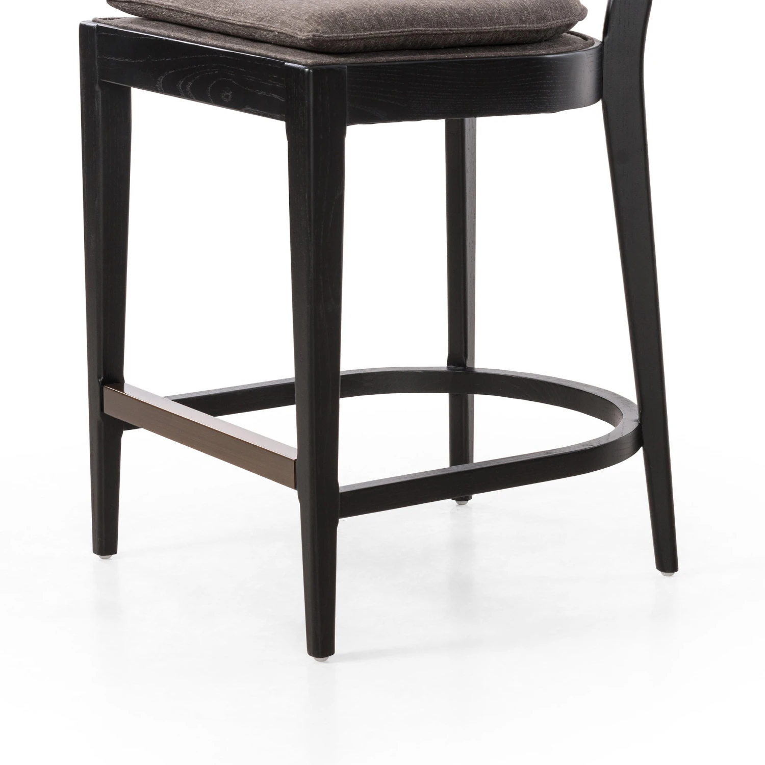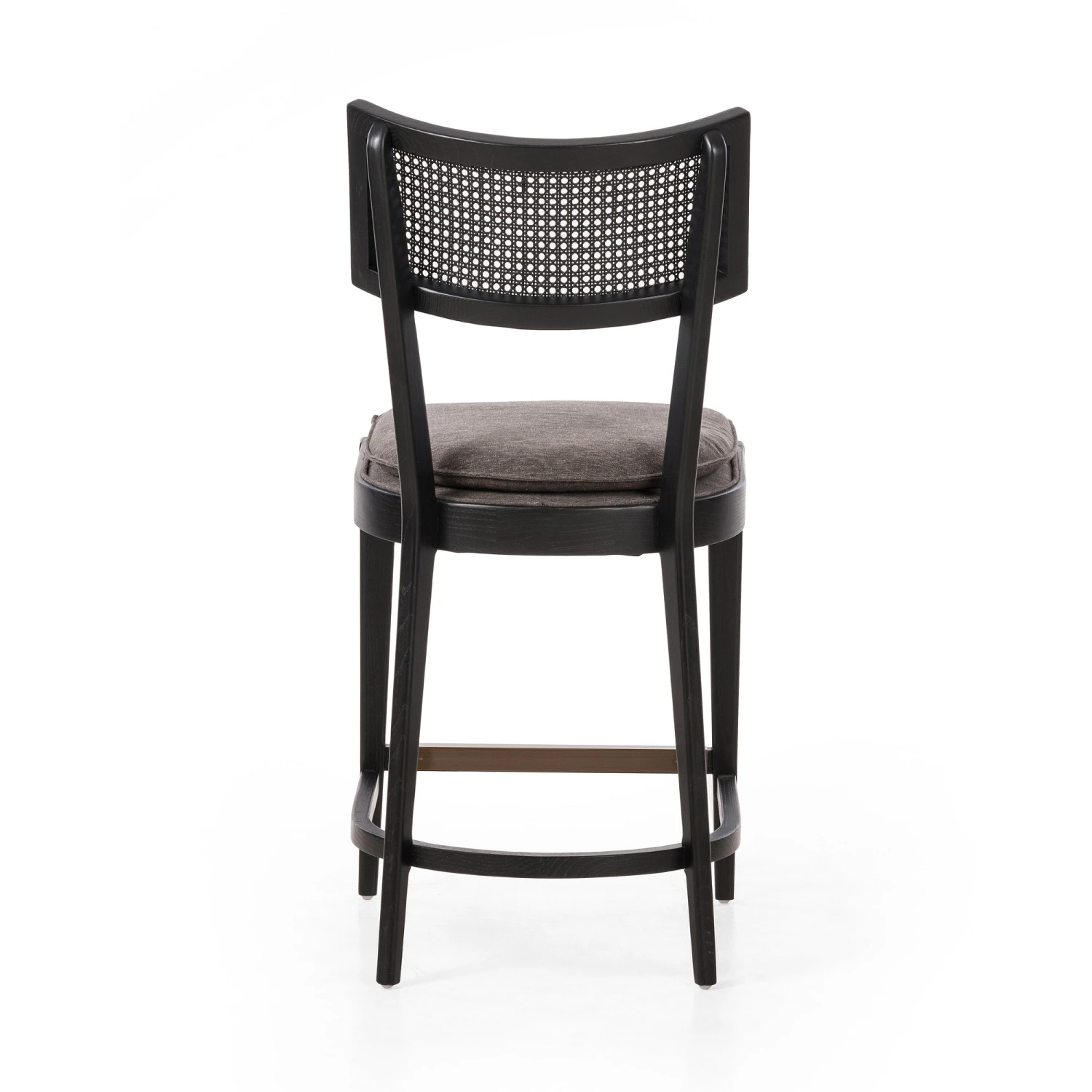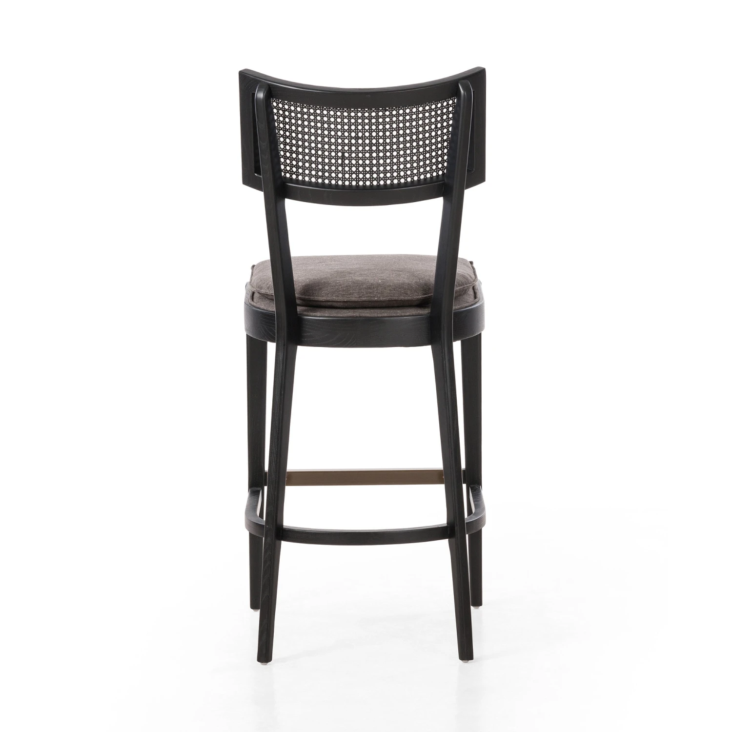 Mixed materials refresh retro styling. Ebony-brushed parawood frames a textural inlay of black cane for a moody, monochromatic look. Fastened by Velcro, a charcoal-colored cushion of high-performance fabric makes this counter stool great for entertaining or everyday use. Performance fabrics are specially created to withstand spills, stains, high traffic and wear, ensuring long-term comfort and unmatched durability.