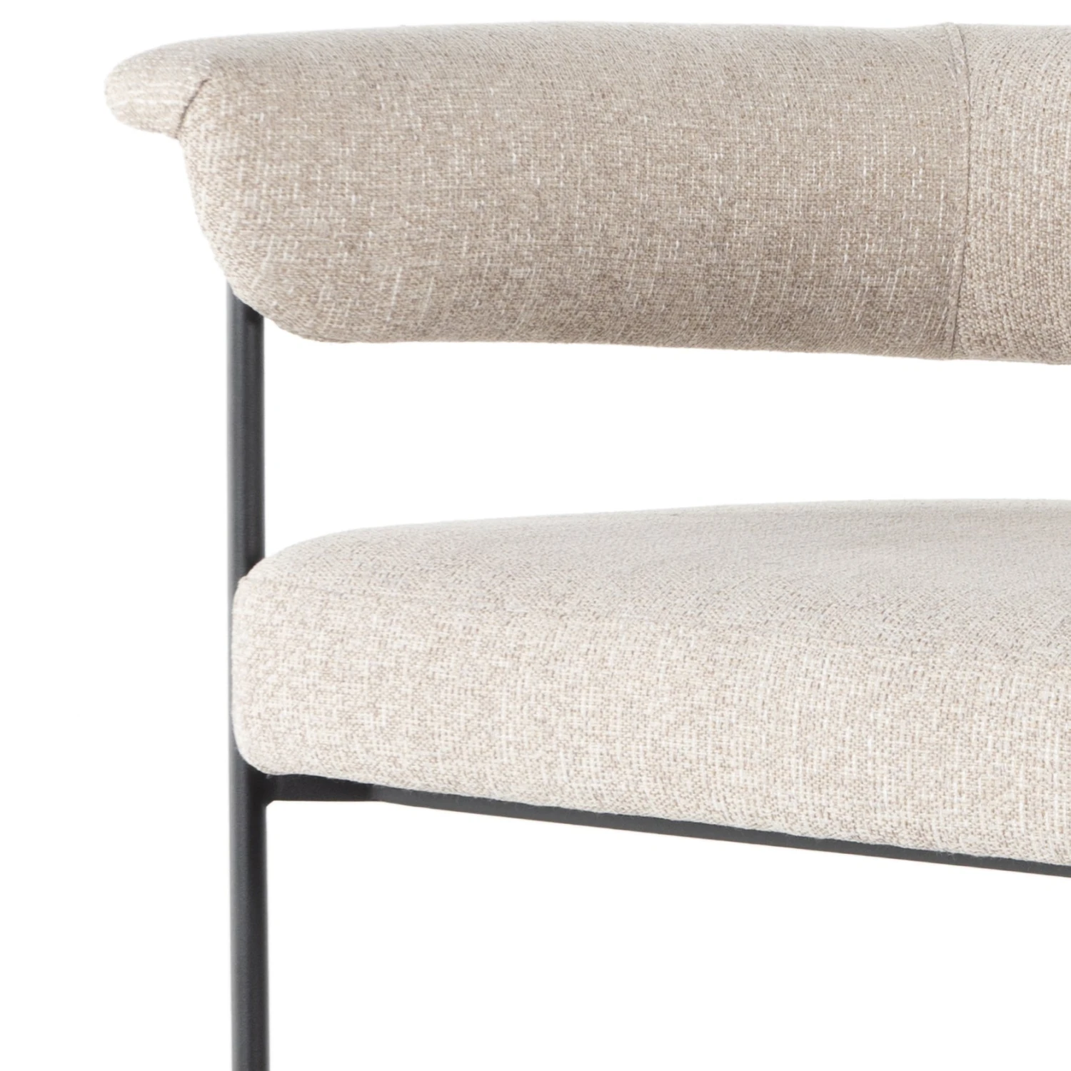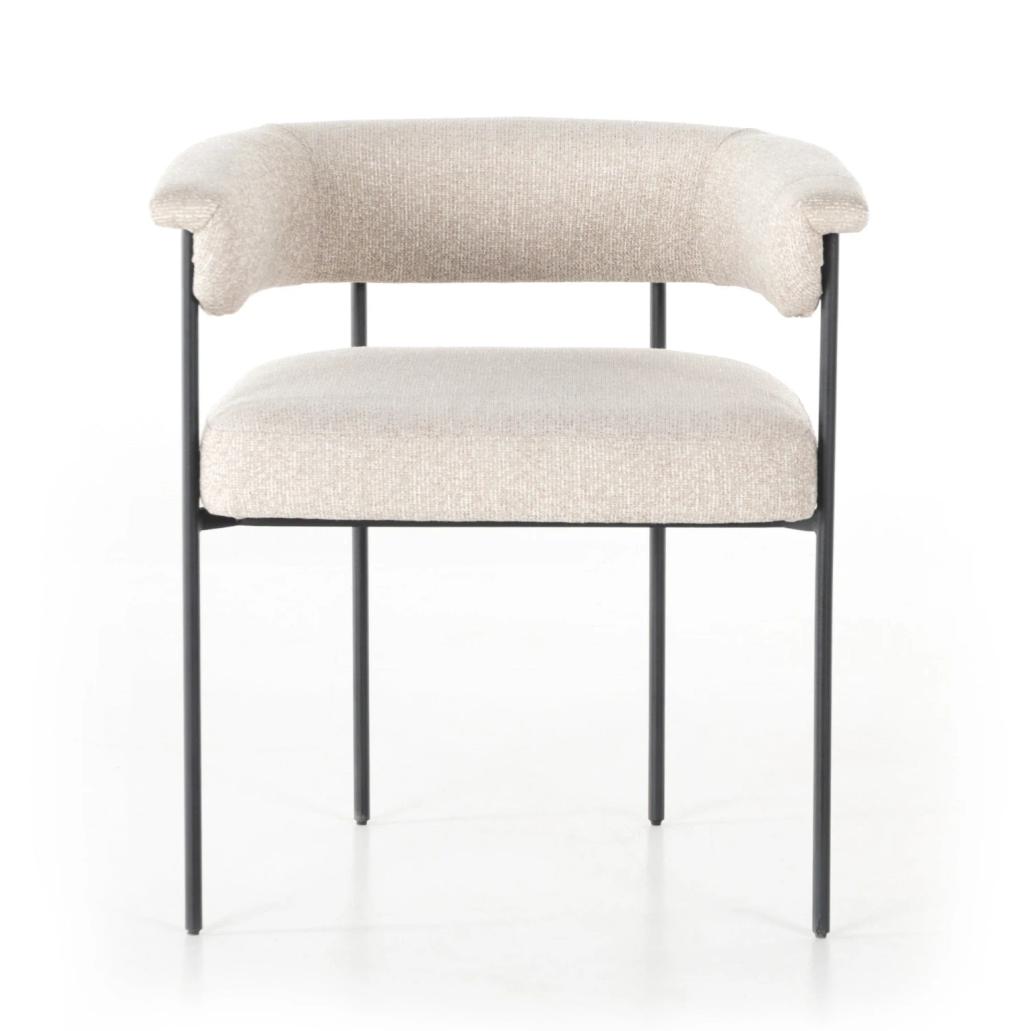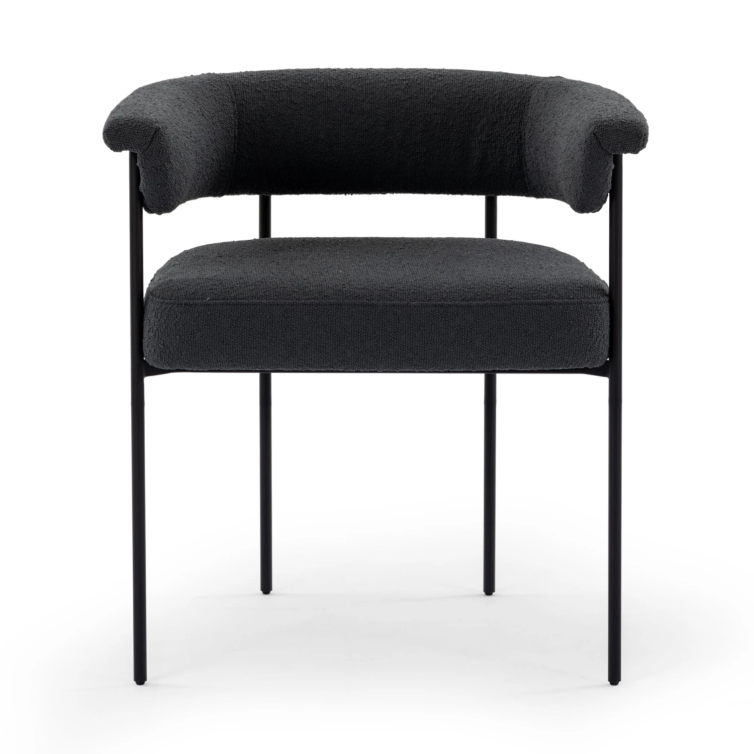 Airy and light with slim, black-finished iron framing, slate-colored performance boucle lends texture to a beautifully sculpted dining style featuring a yoke back and exterior fold detailing. Easy to clean and made from fully recyclable materials, Fiqa fabrics are machine-washable, stain-resistant, water-repellent and antimicrobial.