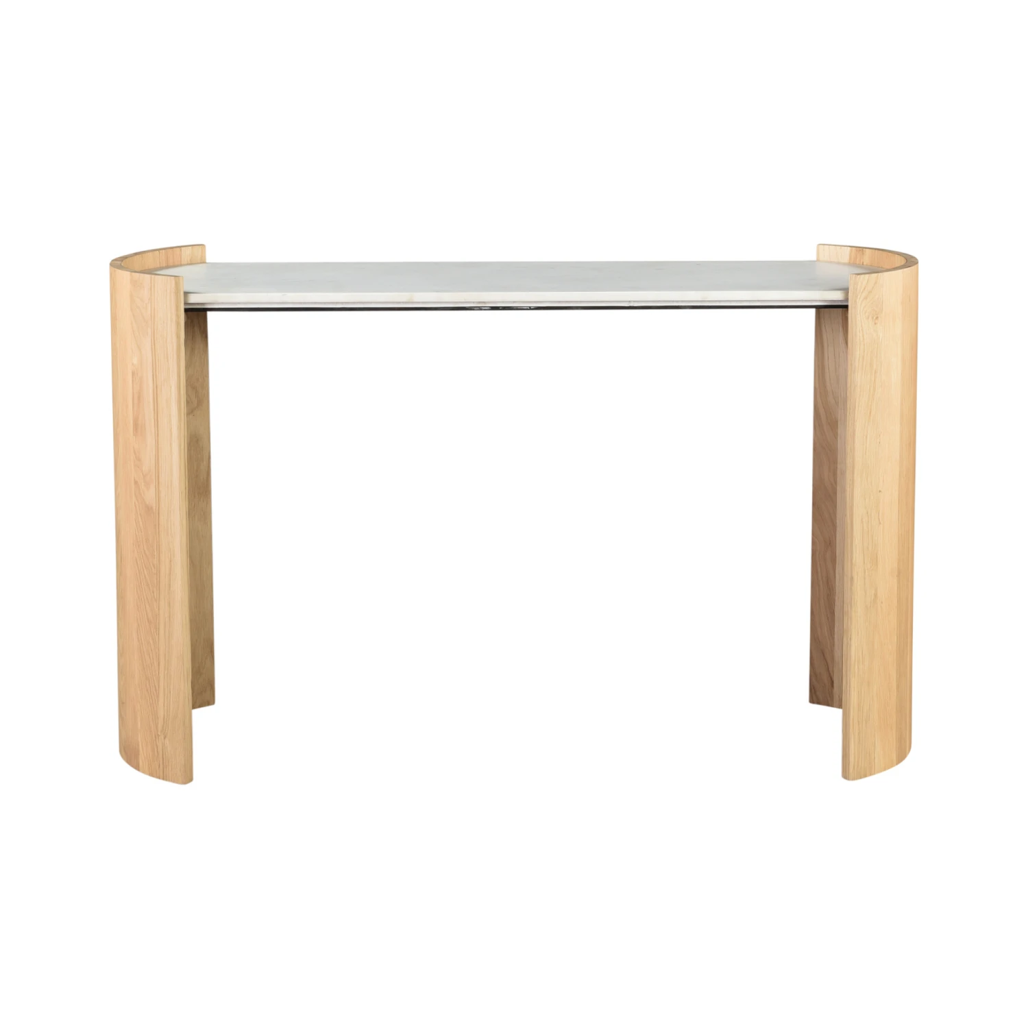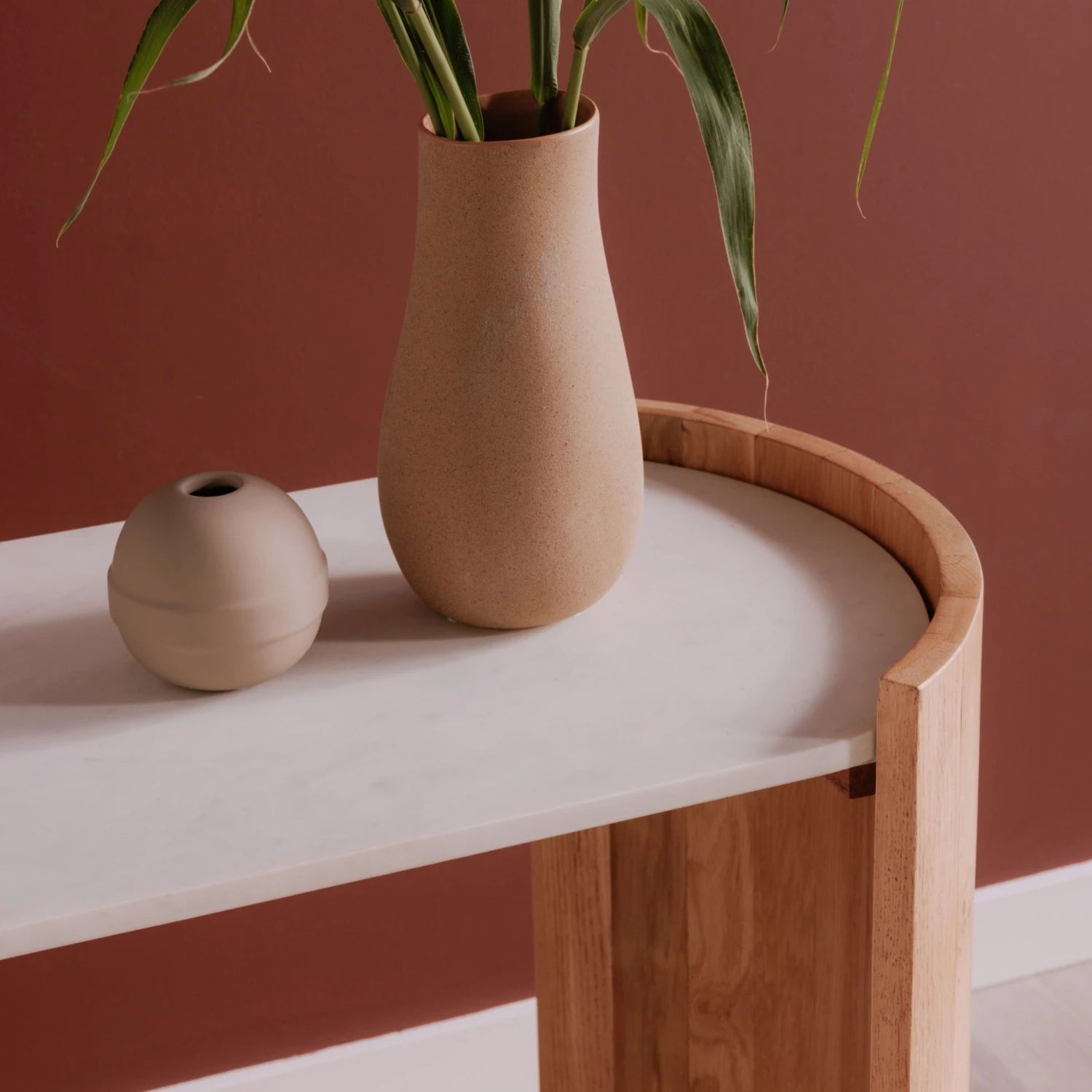 A lunar-like tablescape of raw beauty, elevate your interiors with the stunning modern details of the Dahlia marble & oak console table. Bring this French Art Deco-inspired silhouette to your inner circle, with curved legs detailed in solid oak – the organic wild grains are emphasized with delightful repose. Unfailingly stylish, this design is perfect for layering into your space as a sculptural and sinuous accent table with natural characteristics that only add to its utter charm.