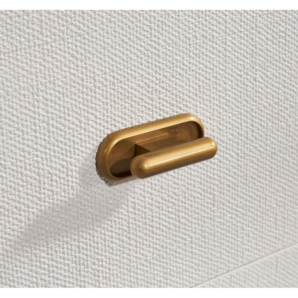 A chic metal frame in an antique brass finish pairs with a faux linen surface in natural white to transform the Mila 6-Drawer Chest into a stunning storage piece.