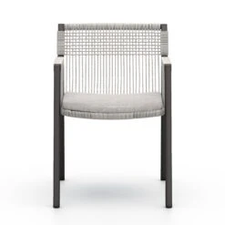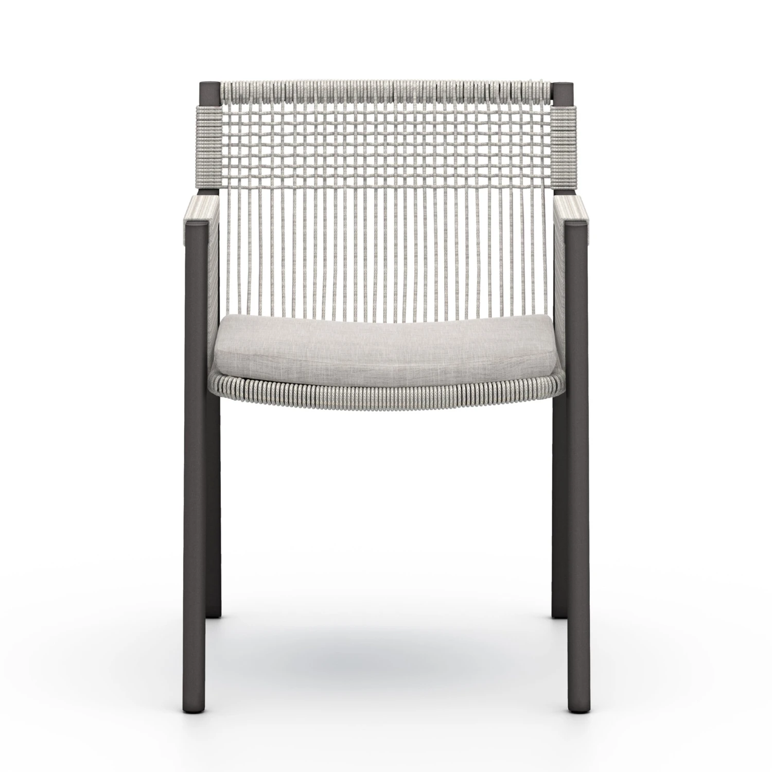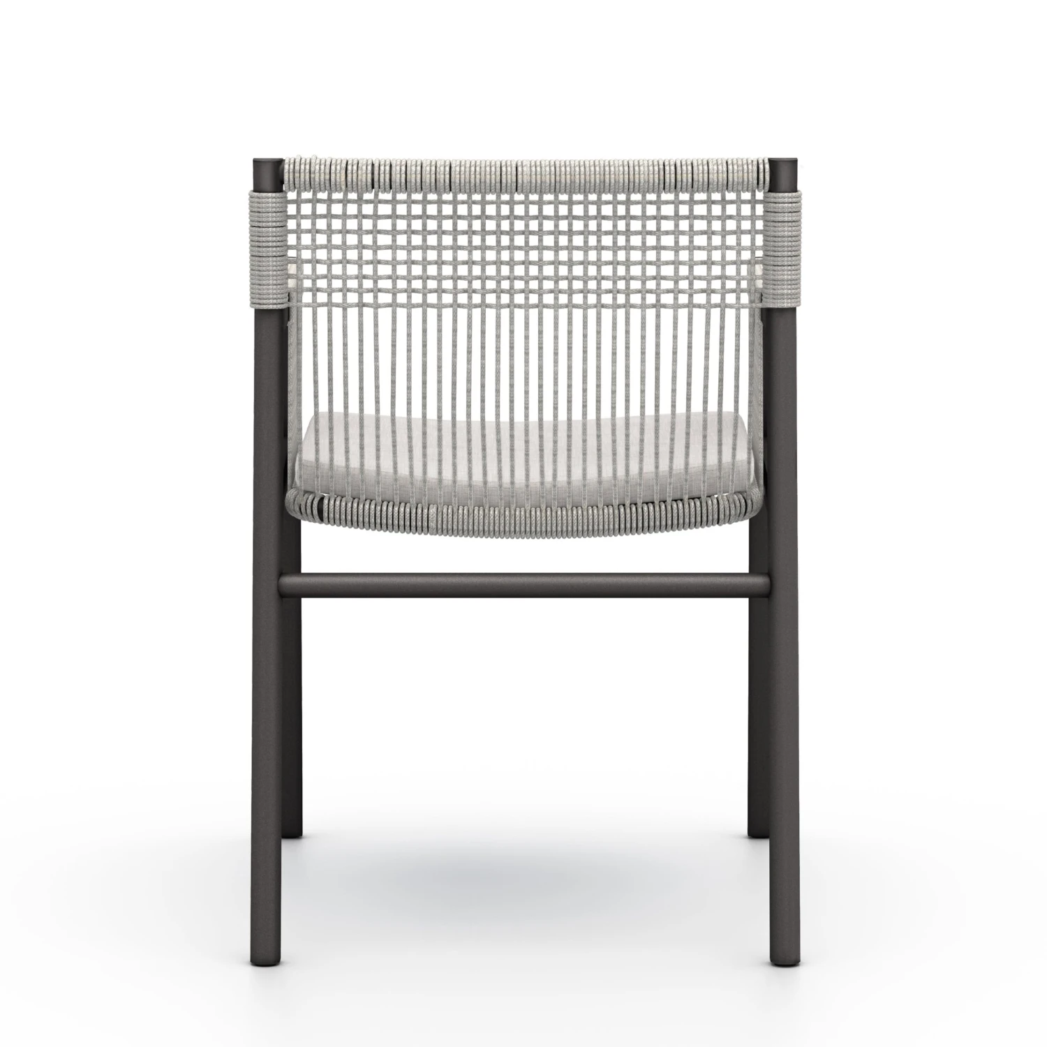 Eyecatching from every angle. Heathered rope is woven at varying widths along the back, sides and arms of this outdoor dining chair for linear detailing all around. Outdoor-friendly aluminum frame with removable seat cushion covered in UV-resistant, water-repellent fabric. Cover or store inside during inclement weather and when not in use.