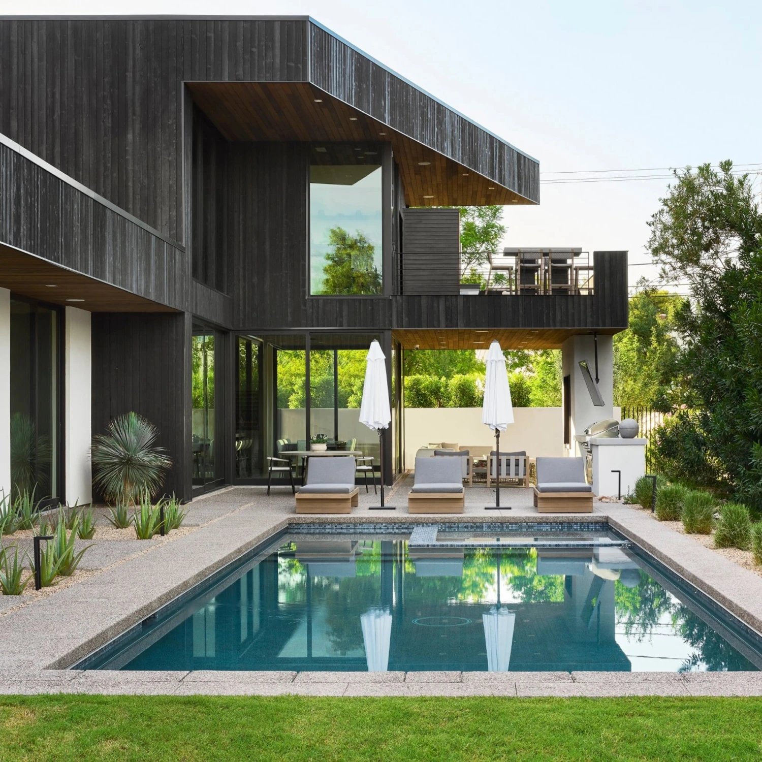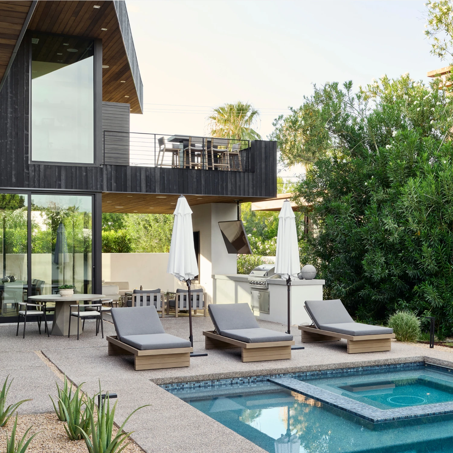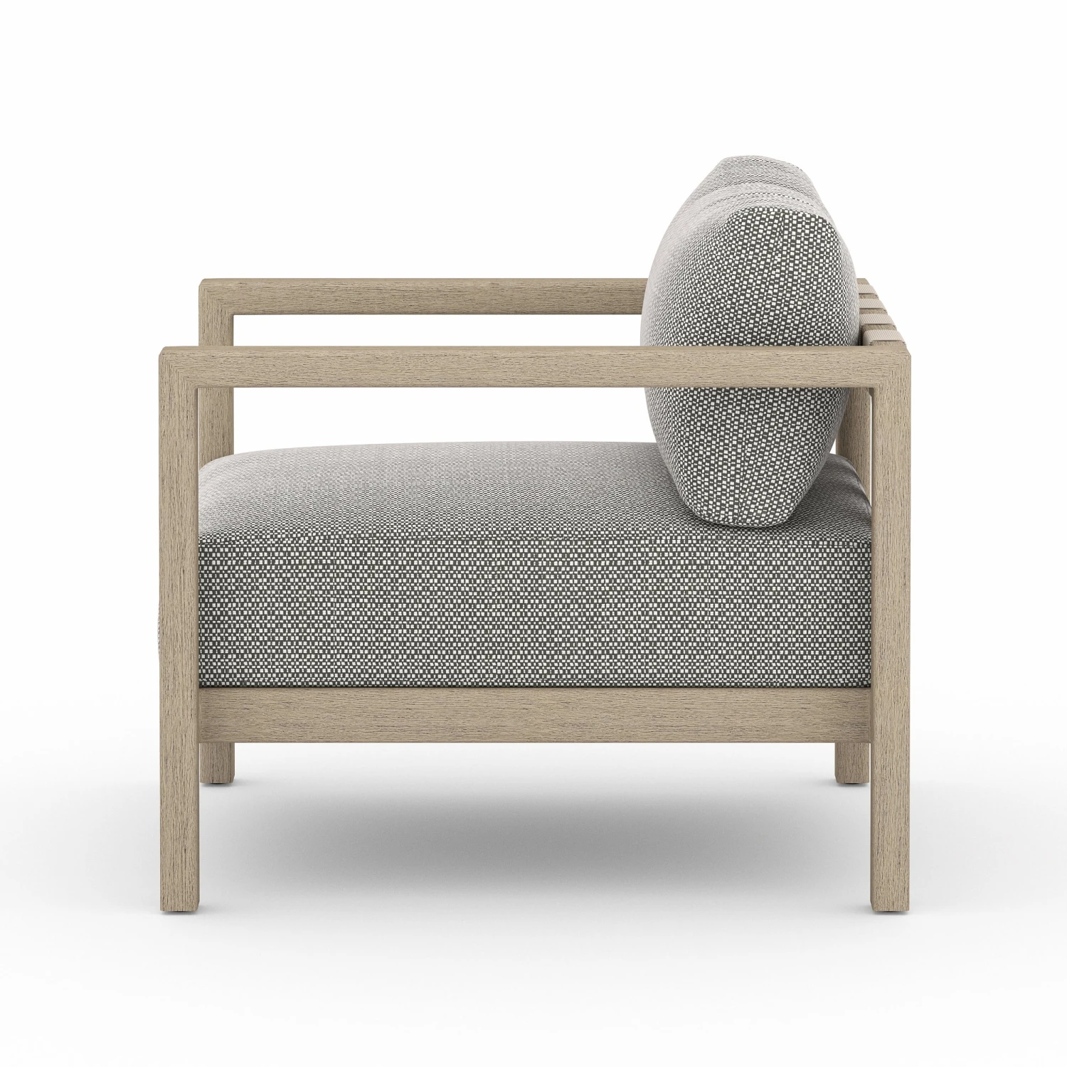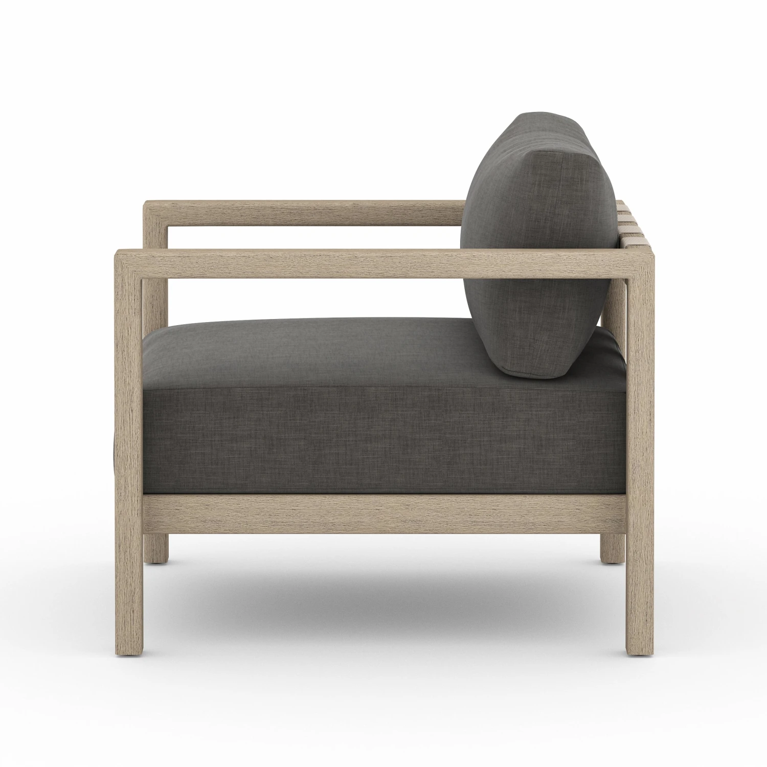 Solid FSC®-certified teak forms a clean frame for UV-resistant, water-repellent fabric. Neutral back straps add intrigue. Cover or store indoors during inclement weather and when not in use.