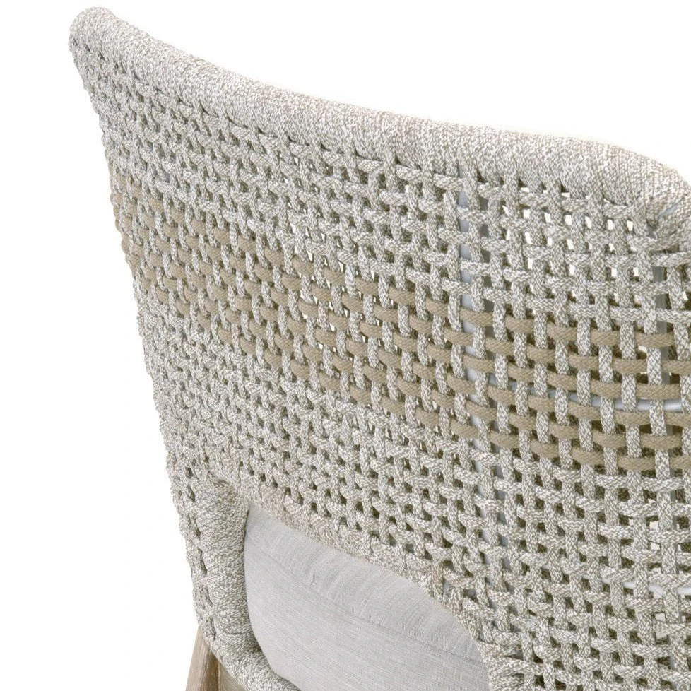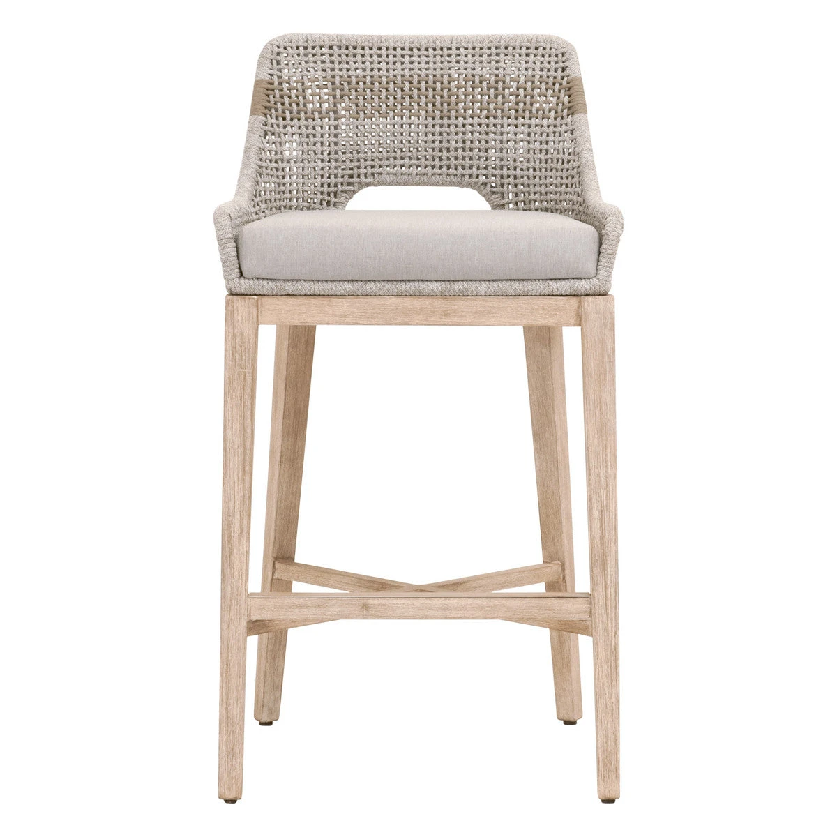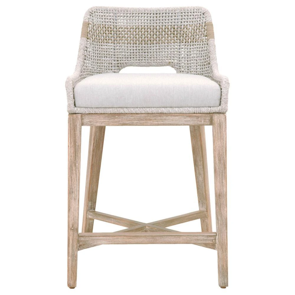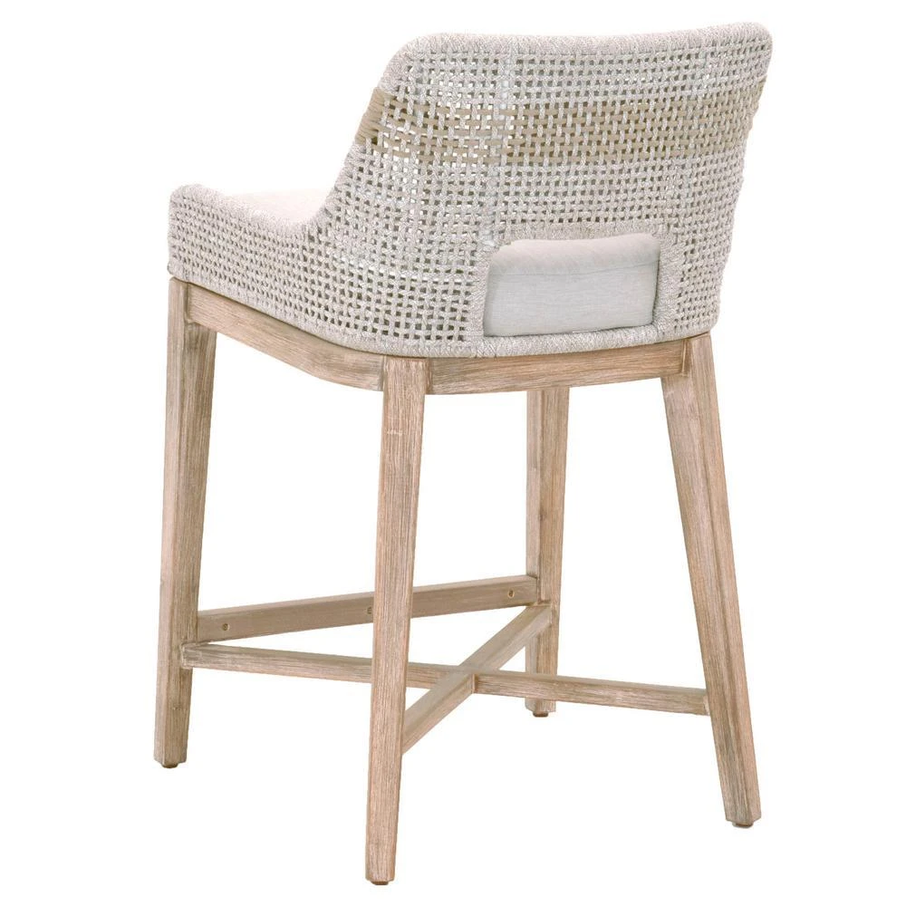This woven counter stool will add a touch of coastal style to your kitchen, bar or dining room. Constructed with a stainless steel frame and solid mahogany legs, this stool is not only sturdy, but durable. A rich taupe and white colored rope is tightly woven with an eye-catching solid taupe stripe interwoven at the center of the seat back. The mahogany legs feature crossed leg stretchers, a front foot rest, and a beautiful distressed natural gray finish. Paired with an upholstered seat cushion affixed to the base, the stool provides comfort with style and will be the perfect addition to any transitional or traditional dining room or bar.
