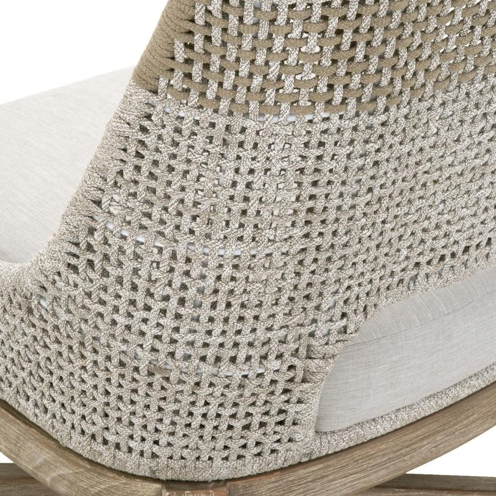 These woven side chairs will add a touch of coastal style to your kitchen or dining room. Constructed with a steel frame and solid mahogany legs, these dining chairs are not only sturdy, but durable. A rich dove colored rope is tightly woven with an eye-catching solid white speckle stripe interwoven at the center of the seat back. The mahogany legs feature a beautiful distressed natural gray finish. Paired with an upholstered seat cushion affixed to the base, the chairs provide comfort with style and will be the perfect addition to any transitional or traditional dining room.