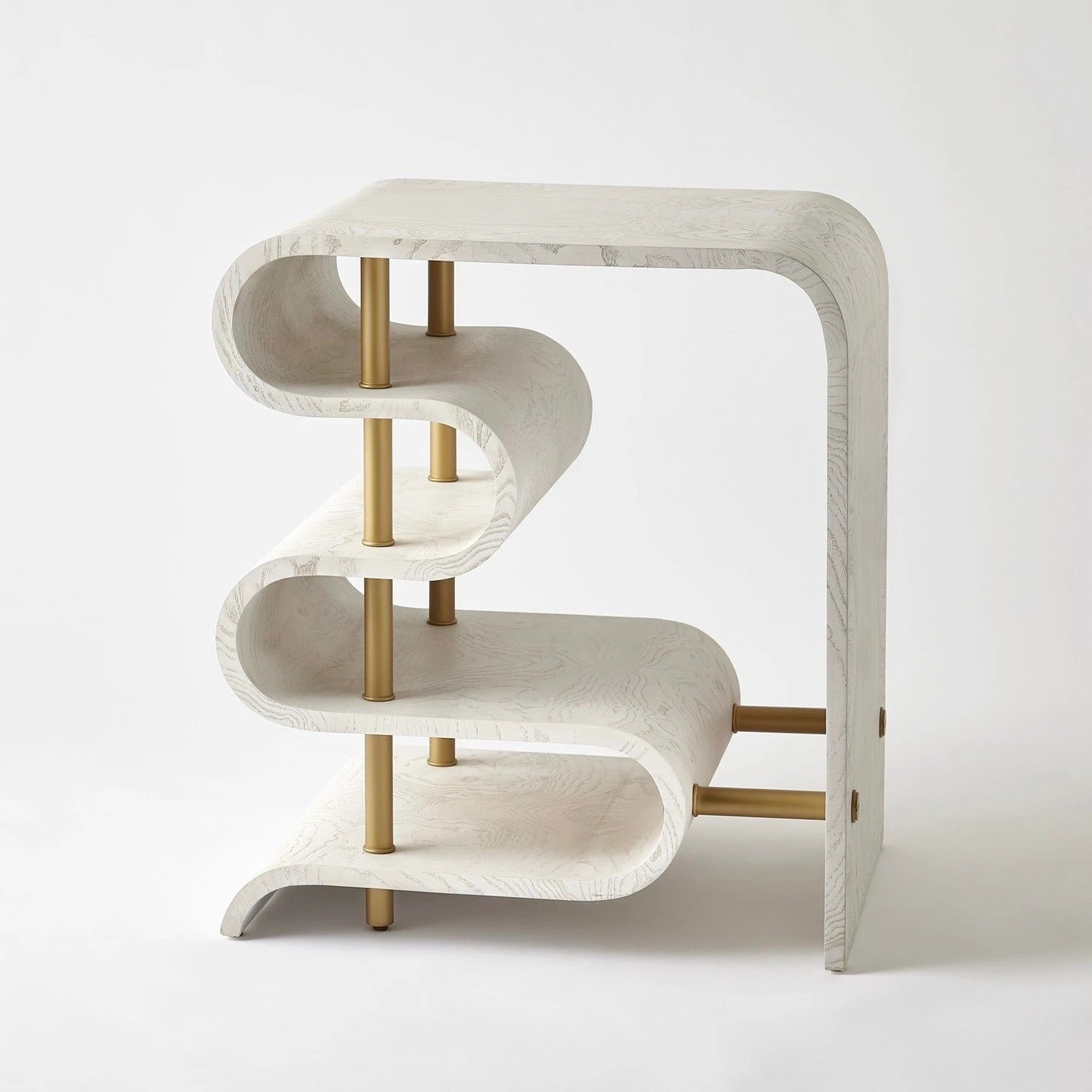 A combination of exquisite form mixed with expertly matched veneers, our signature white-stained finish, and gleaming satin brass accents make this design a true original.